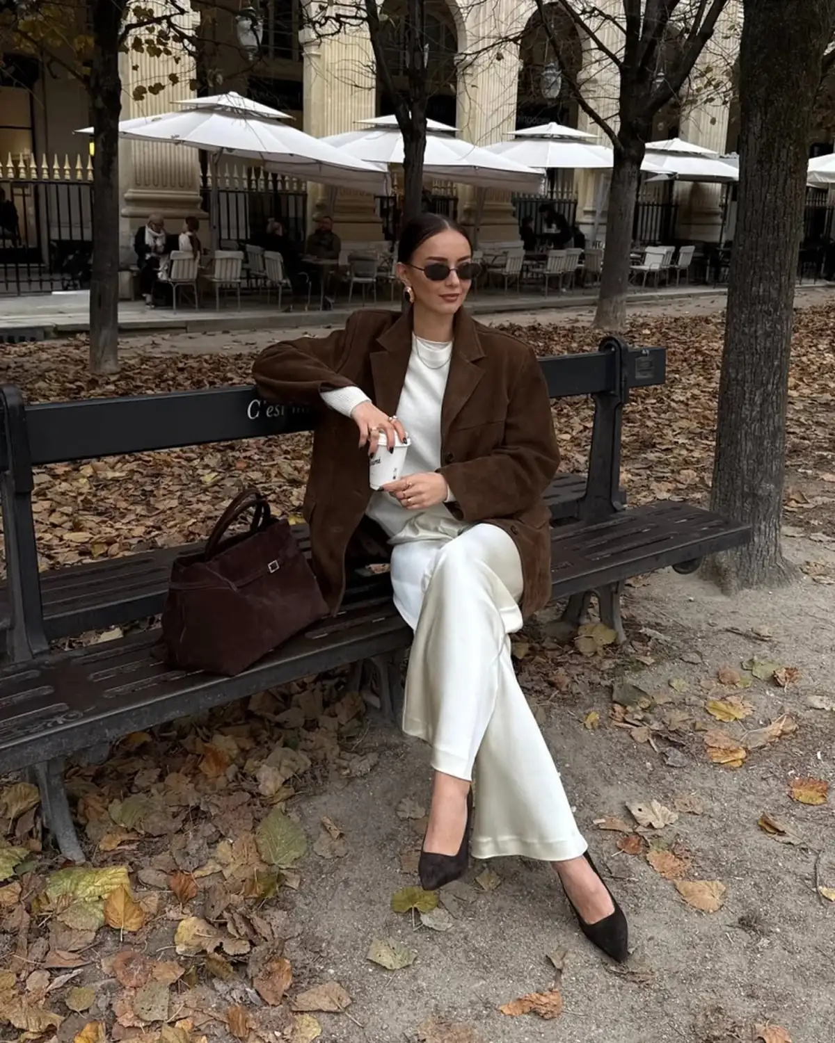 Якщо хочеш додати трохи романтики, зверни увагу на замшевий жакет у дуеті з сатиновими штанами. Поєднання різних текстур і стриманих відтінків створює справжній autumn chic.